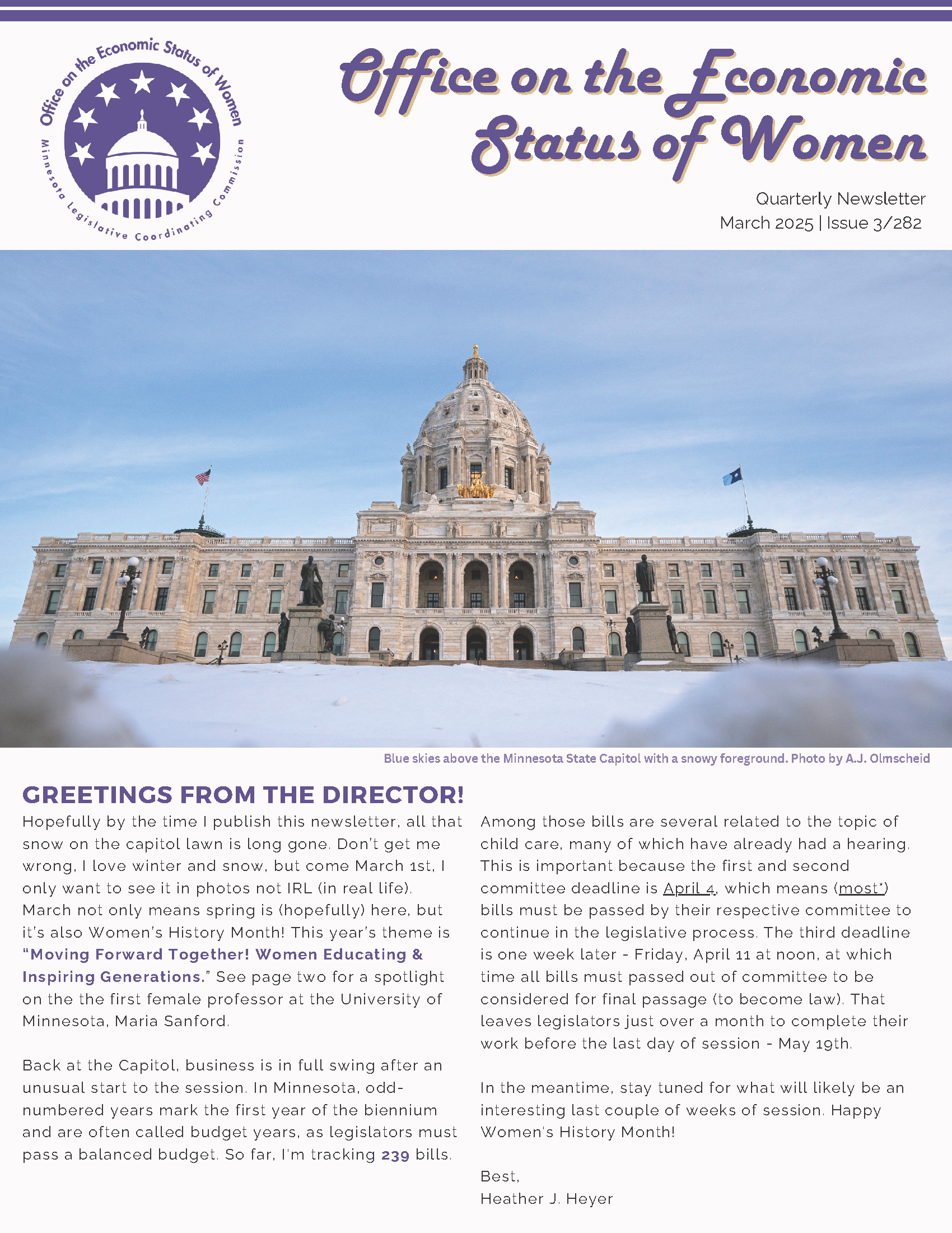 Our monthly newsletter informs on a variety of topics related to women's economic status in Minnesota, including new data and research, information about legislation, local news spotlights, and more.